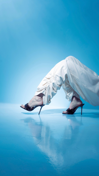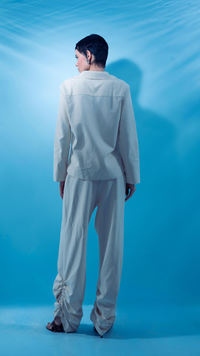 Uma costura percorre verticalmente o centro de cada perna, evocando a alfaiataria. Na barra, o tecido se acumula de maneira proposital sobre o calçado, criando um volume escultural com franzidos laterais.