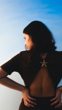 A peça tem mangas curtas e dois tipos de decote: um profundo, com pregas na região do busto, e um segundo nas costas, com aplicação de peça metálica no formato de estrela-do-mar banhada a ouro. O banho é resistente e hipoalergênico, garantindo maior durabilidade, resistência à oxidação e contato seguro com a pele.
